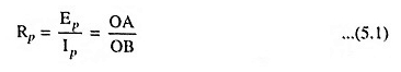 La résistance offerte par une diode au courant direct est appelée résistance à la plaque DC, RP. Il peut être déterminé en déterminant le rapport de la tension totale de la plaque CC à travers la diode au courant de la plaque. À tout point P sur la courbe caractéristique de la plaque (Fig. 5.6), la tension de la plaque est OA et le courant de plaque correspondant est ob.